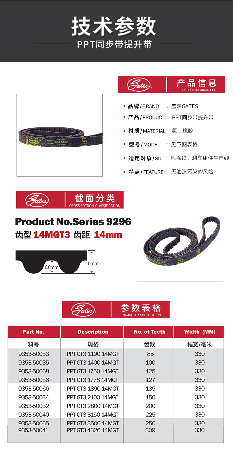 盖茨GATES同步带提升带PowerPaint橡胶传动带PPT GT3 3500 14MGT