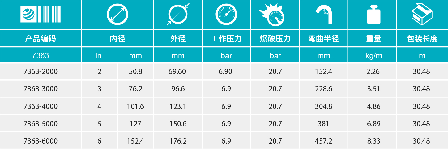 7363系列用于磨损性物料的输送,配套于驳船,料斗和轨道车,3/16"导静电丁苯混合內胶及内置螺旋钢丝具有良好的耐磨性,耐负压和耐扭结性。波纹棱面外层具有良好的耐磨性和耐候性。7363系列最长可到200英尺。
